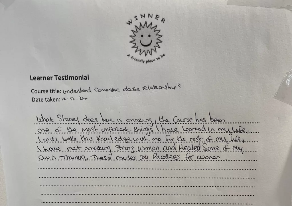 Over 1000 women have been through our training courses over the years. Winner became a recognised National Open College Network training centre offering accredited courses to make sure that the women who attended could build their own portfolio of qualifications, giving them essential workplace skills, and consequently build self sufficiency.